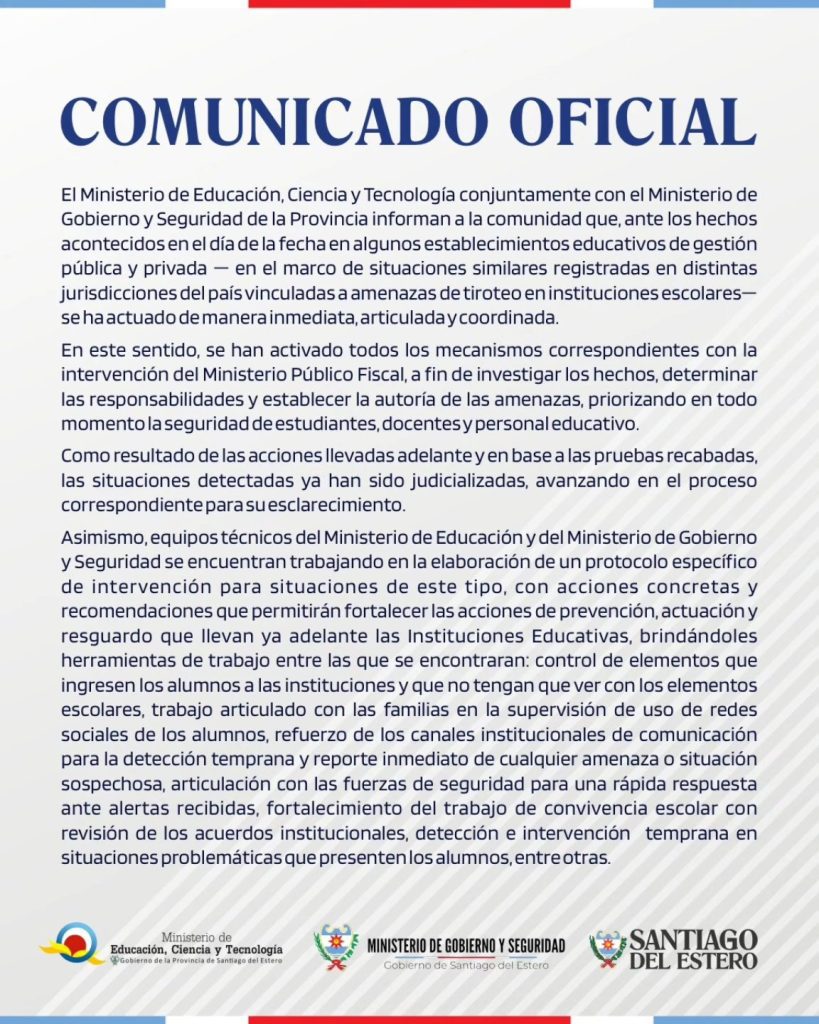 Asimismo, se informó que equipos técnicos de ambas carteras trabajan en la elaboración de un protocolo específico de intervención para este tipo de situaciones. El mismo incluirá medidas de prevención y actuación, como el control de los elementos que ingresan a las instituciones, el fortalecimiento del vínculo con las familias para supervisar el uso de redes sociales, la mejora de los canales de comunicación para detectar amenazas de manera temprana y la articulación con fuerzas de seguridad ante posibles alertas.